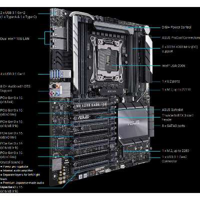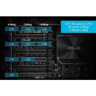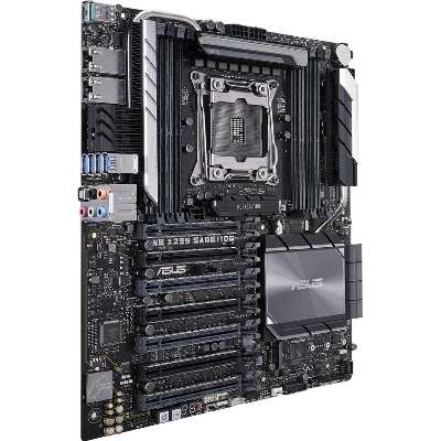 Intel LGA 2066 CEB motherboard with quad-GPU support, DDR4 4200MHz, Dual Intel®10G LANs, M.2, U.2, USB 3.1 Gen 2 connectors, and ASUS Control Center Dual onboard Intel® 10G LAN (X550-AT2) ports: Increased data throughput and improved efficiency, ideal for transferring uncompressed 4K video and backing up large files. Quad-GPU graphics power: Fits up to four dual-slot graphics cards and supports 4-way NVIDIA® SLI™ or AMD CrossFireX™ GPU configurations. 5-Way Optimization: One-click, system-wide tuning, delivers optimized overclocking and intelligent cooling for a diverse range of workloads. Industry-leading cooling options: Comprehensive controls for fans and water pumps, via Fan Xpert 4 software or the acclaimed ASUS UEFI. Ultra-efficient VRM heatsink: Metal-fin-array design maximizes surface area for heat dissipation to enable unthrottled performance. ASUS Control Center: A software utility that provides convenient, secure and cost-saving centralized IT management for small - and medium-sized businesses. Ultra-fast storage: Up to 32Gbps dual M.2, U.2, plus up to 10Gbps USB 3.1 Gen 2 with Type-A and Type-C ports onboard and a front-panel connector. The new WS X299 Sage/10G motherboard delivers a blend of tremendous GPU performance with up to Quad-SLI support, server-grade validation and comprehensive cooling options to provide the perfect system build for training neural networks and crunching other scalable compute loads. It shares the same refined aesthetics as WS X299 Sage/10G and adds dual 10 Gigabit Ethernet ports with the Intel X550AT2 10GBASE-T controller for uncompromising networking performance. Dual PLX chips extend the number of PCIe lanes to provide additional expansion slots, giving you robust connectivity options to configure your system with the tools you need to get your job done. Workstation exclusiveDual onboard 10G LAN Featuring dual onboard 10G LAN ports backed by the cutting-edge Intel X550AT2 10GBASE-T Ethernet controller, WS X299 Sage/10G provides server-class connectivity that supports high-density, high-bandwidth and low-latency access-layer networks. With data-rates up to 10Gbps, WS X299 Sage/10G is able to transfer 4K videos and other large files in a fraction of the time required by conventional networking gear. The onboard controller negates the need to allocate a PCI Express slot to a dedicated network card, saving valuable space for other components. Multi-GPU support WS X299 Sage/10G fits up to four dual-slot graphics cards and supports both NVIDIA® SLI™ and AMD CrossFireX™ 4-way configurations to enable multi-GPU setups that harness the full power of the latest graphics technologies, including NVIDIA® Quadro®. With performance beyond 15.23 TFLOPS, NVIDIA Quadro is the perfect complement to WS X299 Sage/10G, delivering the best performance for design, modeling, medical research, and processing- intensive simulation and rendering applications. ASUS Control Center WS X299 Sage/10G features ASUS Control Center (ACC), a centralized and integrated IT management platform for monitoring and controlling ASUS commercial products, including servers, workstations and digital signage. ACC enables remote BIOS updates, monitoring of multiple systems via mobile devices, and one-click software updates and dispatching, allowing easier server management for any IT infrastructure.