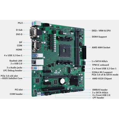 Micro-ATX A520 business motherboard with enhanced security, reliability and manageability AMD AM4 socket: Ready for Ryzen™ 5000 Series/ 4000 G-Series/ 3000 Series Desktop Processors ASUS-exclusive self-recovering BIOS technology for automatic system BIOS recovery from a verified backup ASUS LPC debug header for more efficient troubleshooting Supports SMBUS header that connects to a DASH LAN for remote IT management Innovative moisture-resistant coating to protect the motherboard from harsh environments Event log for capturing and managing detailed system information Commercial BIOS kit to make customization faster and more efficient ASUS Control Center Express(ACCE) to make IT endpoint management easier Pro ASUS Pro business motherboards provide enhanced features to smooth your IT operations, including comprehensive system protection, 24/7 stability and reliability and an improved management suite for easier customization. Known as the world's biggest and best-known motherboard brand, ASUS provides world-class after-sales service and guaranteed long-term availability to maximize your investment over the product life cycle and offers a high-quality, TCO-optimized solution for your business computing-needs. ASUS Corporate Stable Model ASUS Corporate Stable Model (CSM) is a commercial program designed to provide stable and reliable motherboards. Offering up to 36-month product lifecycle support and 6-month end-of-life notice to allow sufficient lead times for your organization to get ready for product transitions. Each purchase of an ASUS CSM motherboard comes with ASUS Control Center Express - server-grade IT management software. ASUS Control Center Express ASUS Control Center Express is an integrated IT monitoring and management software designed to deploy faster, simplify IT operations and improve productivity with comprehensive control and user-friendly functions. ASUS Control Center Express is compatible with over 100 ASUS motherboards to provide a high-quality, TCO-optimized solution for your business needs. Optimize IT endpoint management Designed to assist IT staff in monitoring and controlling devices within their corporate networks, and facilitate inventory checking in multiple locations remotely Automate IT maintenance Allows IT staff to schedule automatic updates of the latest BIOS, software and utilities to specific or all devices at off-peak times, enhancing system stability and IT operational flexibility Securely manage all of endpoints Securely manage endpoint configuration, portable storage access and PC software applications by enabling them to create grouping rules on individual devices Internationally Certified Business Motherboard ASUS business motherboards are enterprise proven with leading quality that exceeds industry standards. Certified by multiple international safety and environmental organizations, ASUS business motherboards provide a safe, secure and sustainable solution, making them the ideal choice for your business. ASUS Shield Enhances system security from bottom to top ASUS Reliant Ensures consistent performance with the finest components and rigorous reliability testing Management Suite Makes customization and management more efficient