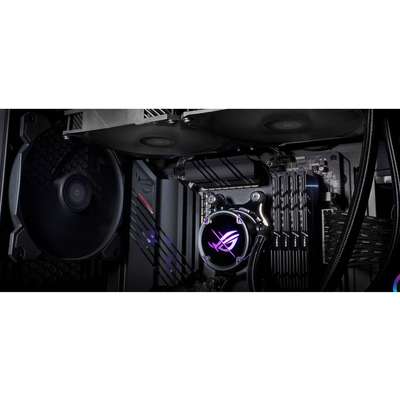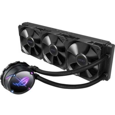 ROG Strix LC II 360 all-in-one liquid CPU cooler with Aura Sync, Intel® LGA 1150/1151/1155/1156/ 1200/2066 and AMD AM4/TR4 support and dual ROG 120 mm addressable RGB radiator fans Seventh Gen Asetek pump delivers exceptional cooling and minimal noise with an operating range starting at 840 rpm. Dual ROG-designed radiator fans provide optimized airflow and static pressure. lighting on the NCVM-coated pump cover and the radiator fans conveys a sleek, modern design. Aesthetic perfectly complements ROG motherboards from center stage. Reinforced, sleeved tubing offers increased durability. ROG Strix LC II 360 delivers high-performance CPU liquid cooling with sleek, modern aesthetics. Featuring a closed-loop design and ROG radiator fans, the cooler unleashes the full potential of an Intel® or AMD CPU while enabling subtle multicolor lighting effects to accentuate your build. NEXT-LEVEL CUSTOMIZATION | Emanate Your Style From end to end, ROG Strix LC II 360 showcases the iconic ROG aesthetic. Engraved ROG lettering on the radiator's side complements the iridescent lettering on the hubs of each fan. And the Aura Sync-compatible pump cover radiates the new ROG logo in any color you choose. COOL TO THE CORE | Optimized Fan Design The ROG radiator fans are specifically tuned to deliver optimum performance on ROG Strix LC II series radiators. The fans generate 81 CFM / 5.0 mmH2O for exceptional cooling efficiency. Enhanced Pump Design ROG Strix LC II series is equipped with the latest cooling-plate design. Machined from pure copper, the plate features an array of fine micro-channels that reduce thermal resistance and increase surface area, resulting in lower CPU temperatures. PWM-Controlled Pump and Fans PWM control enables both the pump and radiator fans to spin at slower speeds when the CPU is idling or under light load, helping to keep noise levels to a minimum. COMPREHENSIVE COMPATIBILITY ROG Strix LC II series is compatible with a wide range of Intel® and AMD motherboard platforms, giving you the flexibility to pair it with your choice of processor. With 380mm of tubing at your disposal, radiator installation is equally as flexible in a variety of chassis.