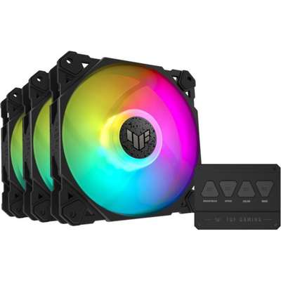 TUF GAMING | TF120 ARGB Fans | Lighting the Way TUF Gaming TF120 ARGB system fans bring new layers of cool to your build. Each fan in this 3-pack features a high-luminance, double-layer LED array that pumps out deeply saturated colors against a backdrop of high airflow, low noise, and rugged durability, leaving the competition completely in the dark.Exemplary Performance | Deliberately Balanced Rotor. Bearings. Electronics. All optimized to pump out a class-leading 76 CFM, low noise, and balanced static pressure, making the TUF Gaming TF120 ARGB ideal for all chassis positions or radiators that feature low or medium-density fin arrays. Advanced fluid dynamic bearing | Fidget-free spinner The TF120 rotor assembly spins on an advanced fluid dynamic bearing rated for up to 250,000 hours of trouble-free operation. Double-Layer LED Array | Colorful Diversity The TF120 features an addressable double-layer LED array that emits light evenly through each fan blade, leaving conventional RGB fans looking washed out. The dual-layer LED structure also facilitates a range of unique lighting effects to make any gaming rig pop.Brightness Adjust the brightness of the ARGB LEDsSpeed Adjust the speed of the ARGB fan LED lighting effectColor Switch between the LED colors for each lighting effectMode Select the lighting effect mode Two Distinct Flavors | Tone up The TF120 ARGB also comes in white, for builders seeking to match a lighter aesthetic or establish contrast for their custom rig.