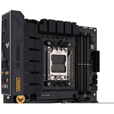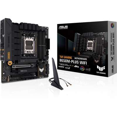 ASUS TUF GAMING B650M-PLUS WIFI takes all the essential elements of the latest AMD Ryzen 7000-series processors and combines them with game-ready features and proven durability. Engineered with military-grade components, an upgraded power solution and a comprehensive cooling system, this motherboard goes beyond expectations with rock-solid and stable performance for marathon gaming. TUF GAMING motherboards also undergo rigorous endurance testing to ensure that they can handle conditions where others may fail. Aesthetically, this model incorporates rugged off-black and geometric design elements to reflect the dependability and stability that defines the TUF GAMING series. INTELLIGENT CONTROL Comprehensive controls form the foundation of the ASUS TUF GAMING series. The TUF GAMING B650 motherboard packs flexible tools to tune every aspect of your system, enabling performance tweaks to perfectly match the way you work to maximize productivity. ROCK-SOLID PERFORMANCE With upgraded power delivery and comprehensive cooling options to fuel AMD's latest CPUs, plus support for faster memory and storage, TUF GAMING B650 motherboards are the perfect foundation for your next high-core-count AMD battle rig. Teamed Power Stages 12+2 power stages are each rated to handle 60 amperes, combining high-side and low-side MOSFETS and drivers into a single package to deliver power, efficiency and stable performance for all compatible AMD processors. EASY PC DIY The TUF GAMING line offers easy setup for all builders. The TUF GAMING Alliance ecosystem grants compatibility, while Armoury Crate has Fan Xpert 2+, hardware info, Two-Way AI Noise Cancelation, RGB options and peripheral settings. This platform has intuitive tools to build and optimize dream rigs. Build With Confidence TUF GAMING Alliance is a collaboration between ASUS and trusted PC component brands to ensure compatibility across a wide range of parts, such as PC cases, power supplies, CPU coolers, memory kits and more. With new partnerships and components being added regularly, the TUF GAMING Alliance will continue to grow even stronger. IMMERSIVE GAMING TUF GAMING B650 motherboards provide a feature-packed high-performance gaming package, with ultrafast networking for smoother online gameplay, pristine audio with positional cues for FPS Gaming, and onboard RGB lighting that syncs with attached gear to personalize your gaming atmosphere. THIS CHANGES EVERYTHINGFROM THIS NEW PLATFORM,YOU CAN SEE THE FUTURE Build your next rig with an AMD Ryzen™ 7000 Series processor and ASUS TUF GAMING motherboards to experience advanced performance. With up to 16 "Zen 4" cores and 32 threads, boost clocks of up to 5.7GHz, and 80MB cache, the AMD Ryzen™ 7000 Series keeps you ahead of the game.You'll also gain access to new features for gamers with AMD Socket AM5, from the speed of DDR5 memory to the increased bandwidth of PCIe® 5.0. AMD Ryzen™ 7000 Series processors and AMD socket AM5 motherboards are unlocked for overclocking to personalize your experience. Gain even more performance when you overclock your DDR5 memory with AMD EXPO™ technology.